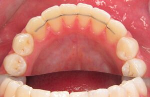 Alternativ kann zusätzlich ein von außen nicht sichtbarer, dünner Draht (Lingualretainer, oben abgebildet) von hinten an die Frontzähne angebracht werden, um die Zähne in ihrer neuen Position zu stabilisieren.