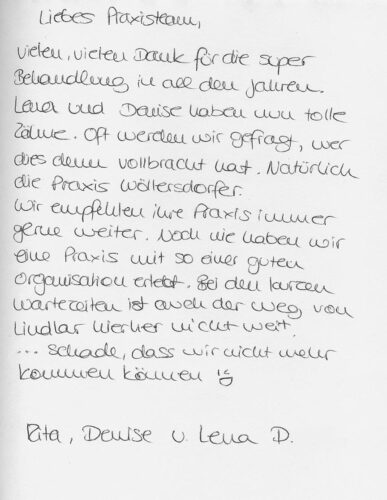 Liebes Praxisteam, vielen, vielen Dank für die super Behandlung in all den Jahren. Lena und Denise haben nun tolle Zähne. Oft werden wir gefragt, wer dies
