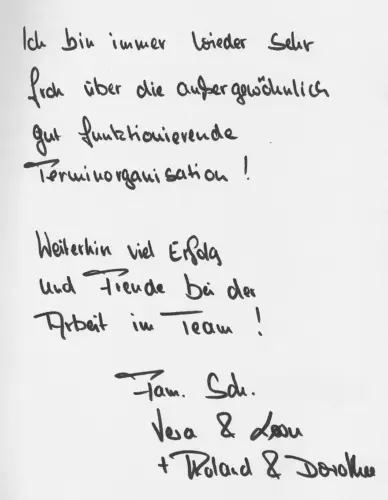 Ich bin immer wieder sehr froh über die außergewöhnlich gut funktionierende Terminorganisation! Weiterhin viel Erfolg und Freude bei der Arbeit im Team! Fam. Sch. – Vera