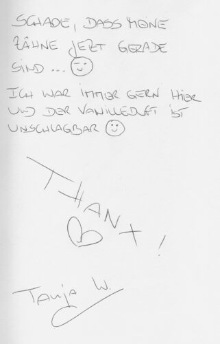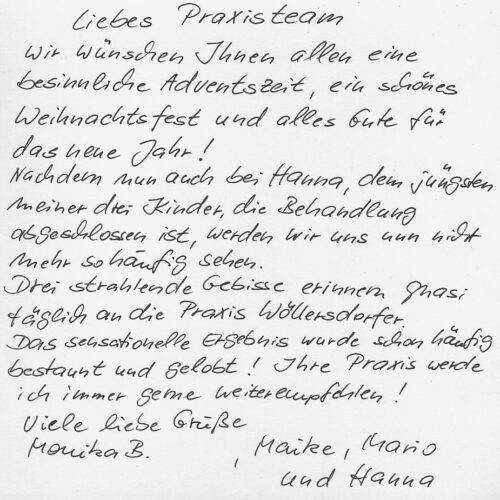 Ich bin immer wieder sehr froh über die außergewöhnlich gut funktionierende Terminorganisation! Weiterhin viel Erfolg und Freude bei der Arbeit im Team! Fam. Sch. – Vera