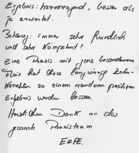Ich bin immer wieder sehr froh über die außergewöhnlich gut funktionierende Terminorganisation! Weiterhin viel Erfolg und Freude bei der Arbeit im Team! Fam. Sch. – Vera