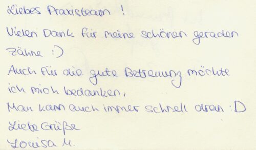 Liebes Praxisteam, Vielen Dank für meine schönen geraden Zähne 🙂Auch für die gute Betreuung möchte ich mich bedankenMan kann auch immer schnell dran 😀 Liebe Grüße